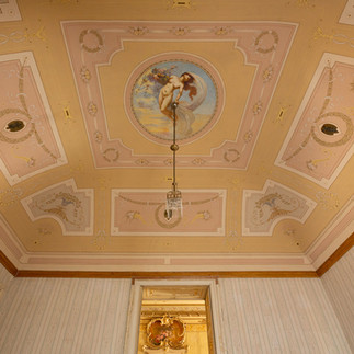 On the first floor there are several majestic rooms with imposing antique mirrors. The precious frescoes in the vault were executed by the famous Catanese painter Alessandro Abate. There are also four lounges overlooking the central hall, one decorated with stucco and the other three with vaults painted with frescoes by the painter Scalia.